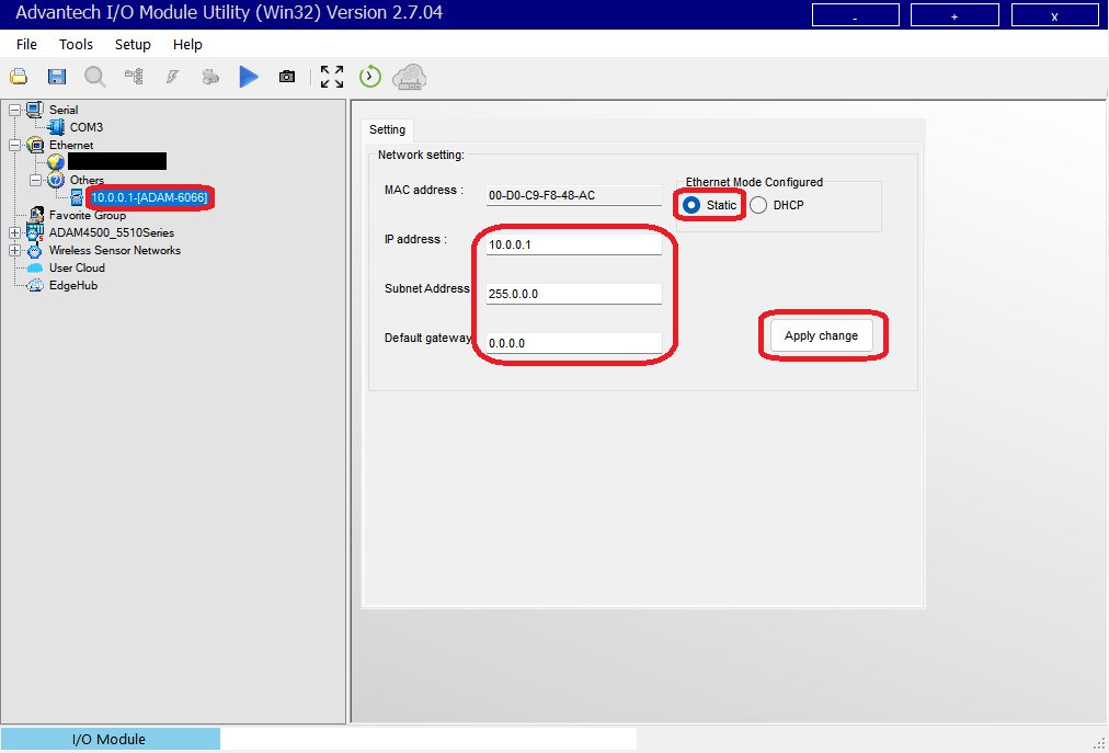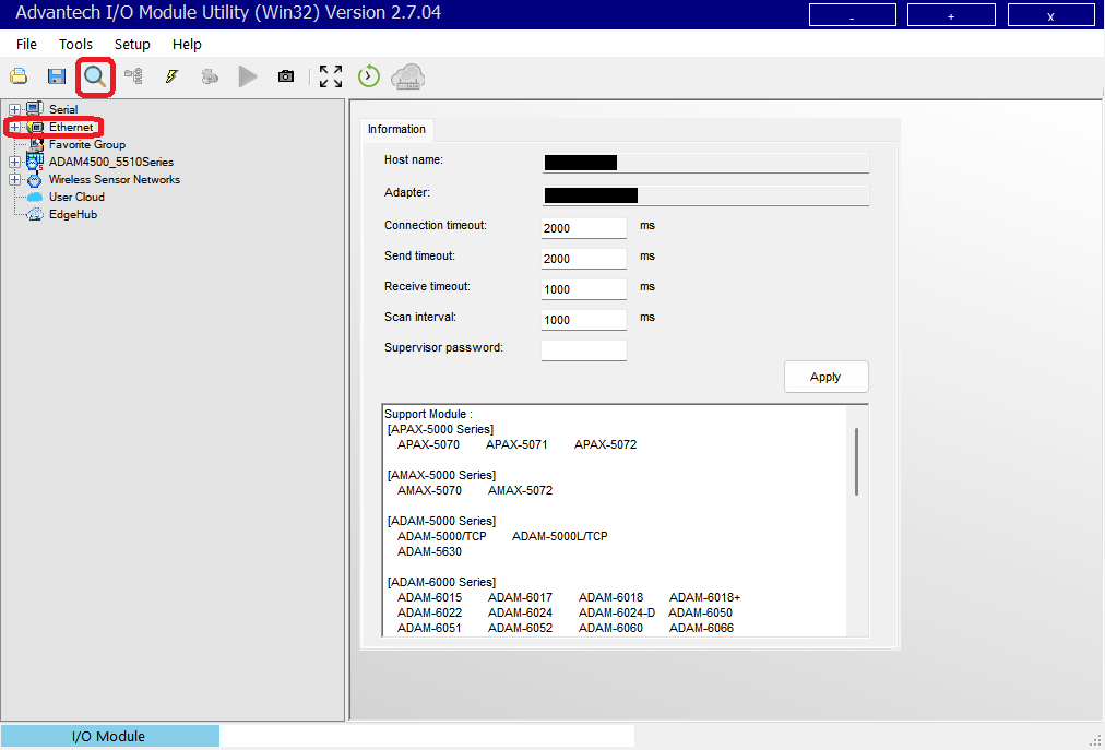 Firstly, download and install the Advantech IO Module Utility from the Advantech website (https://www.advantech.com/ , click Support, then Support & Downloads and search Advantech IO Module Utility)