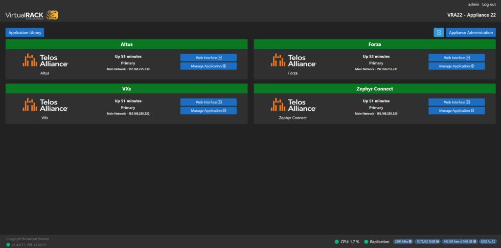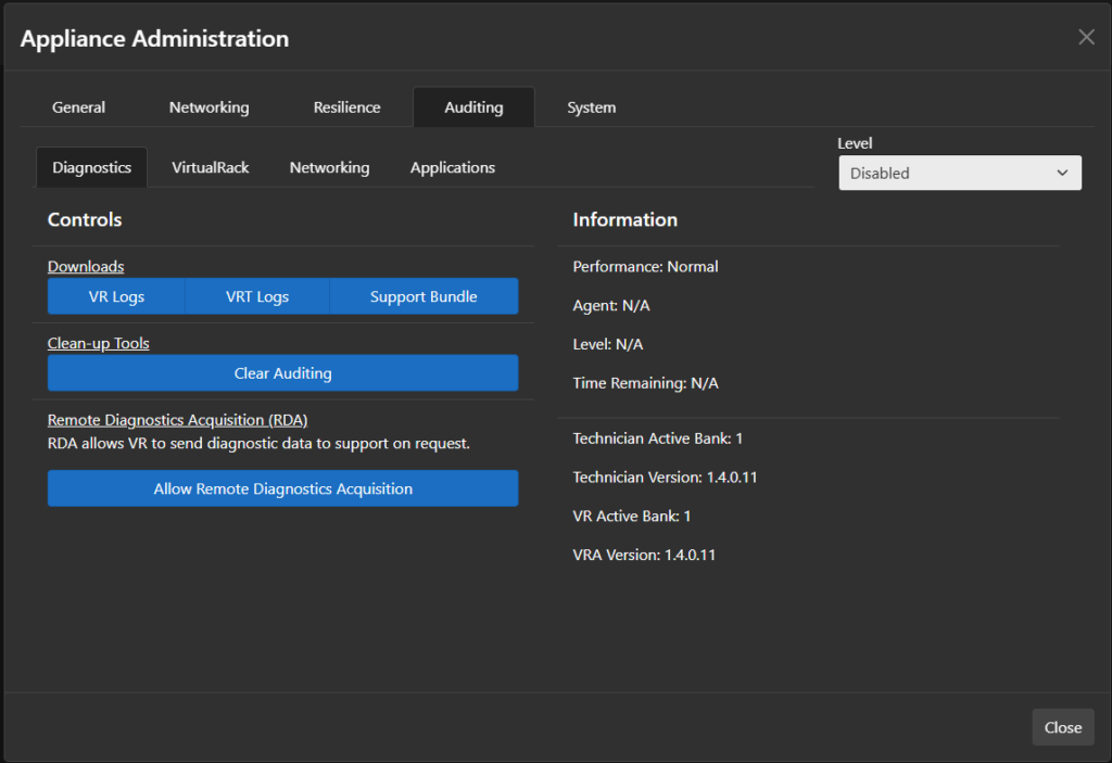 The Appliance Administration window allows the management of the Virtual Rack itself.