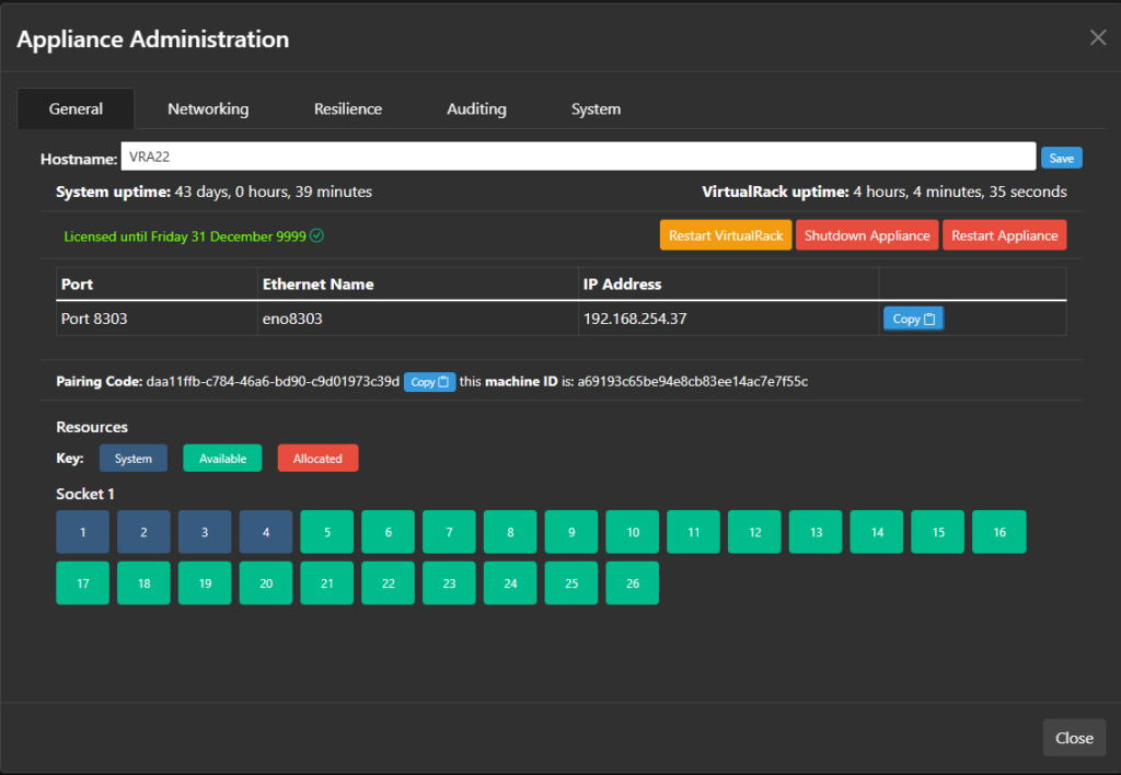 Here the Hostname can be set for the Virtual Rack, the version number can be seen and the information required to pair with another Rack for redundancy. See Pairing for more details.