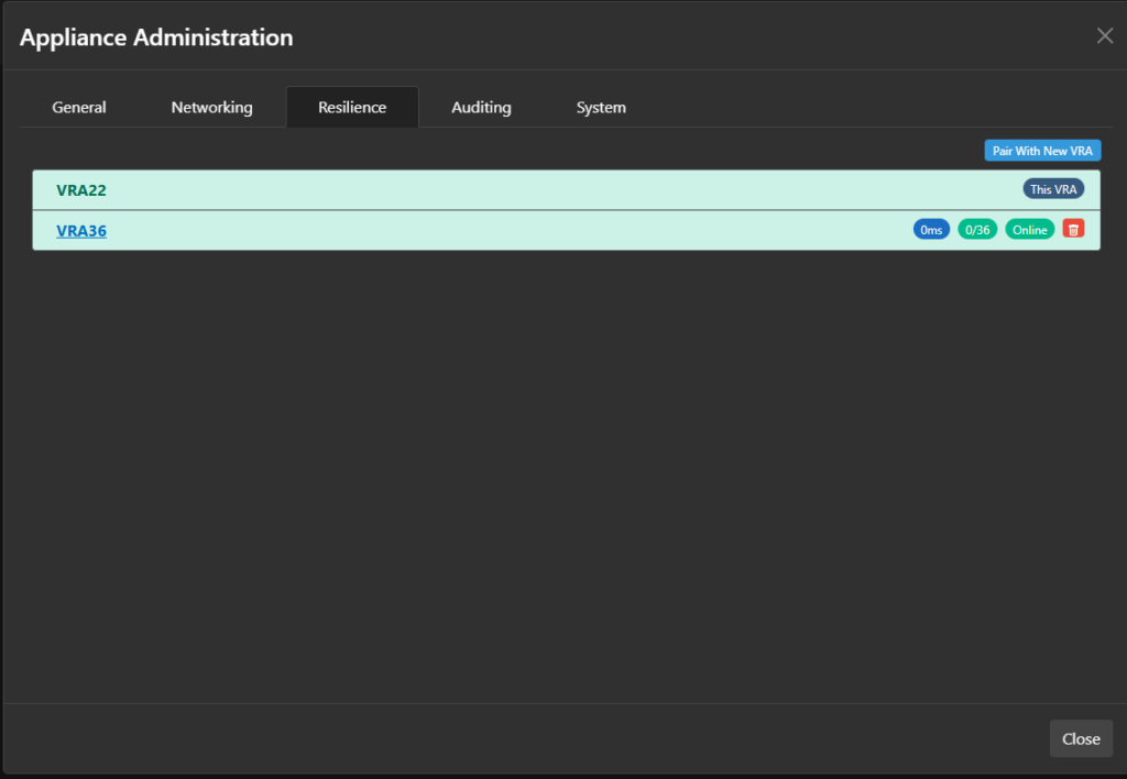 By clicking the “Pair with new VRA” button, the additional VirtualRacks IP & Pairing code can be entered. To find this code see the general tab of the connecting VRA.