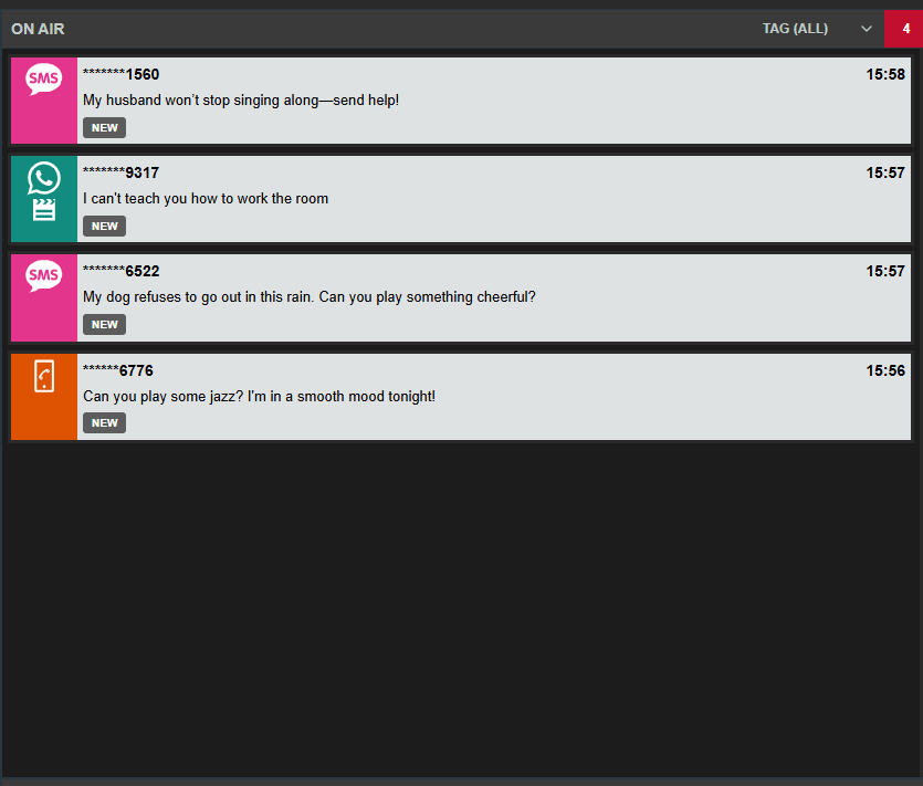 The On Air Queue is the curated list of messages prepared for the presenter.