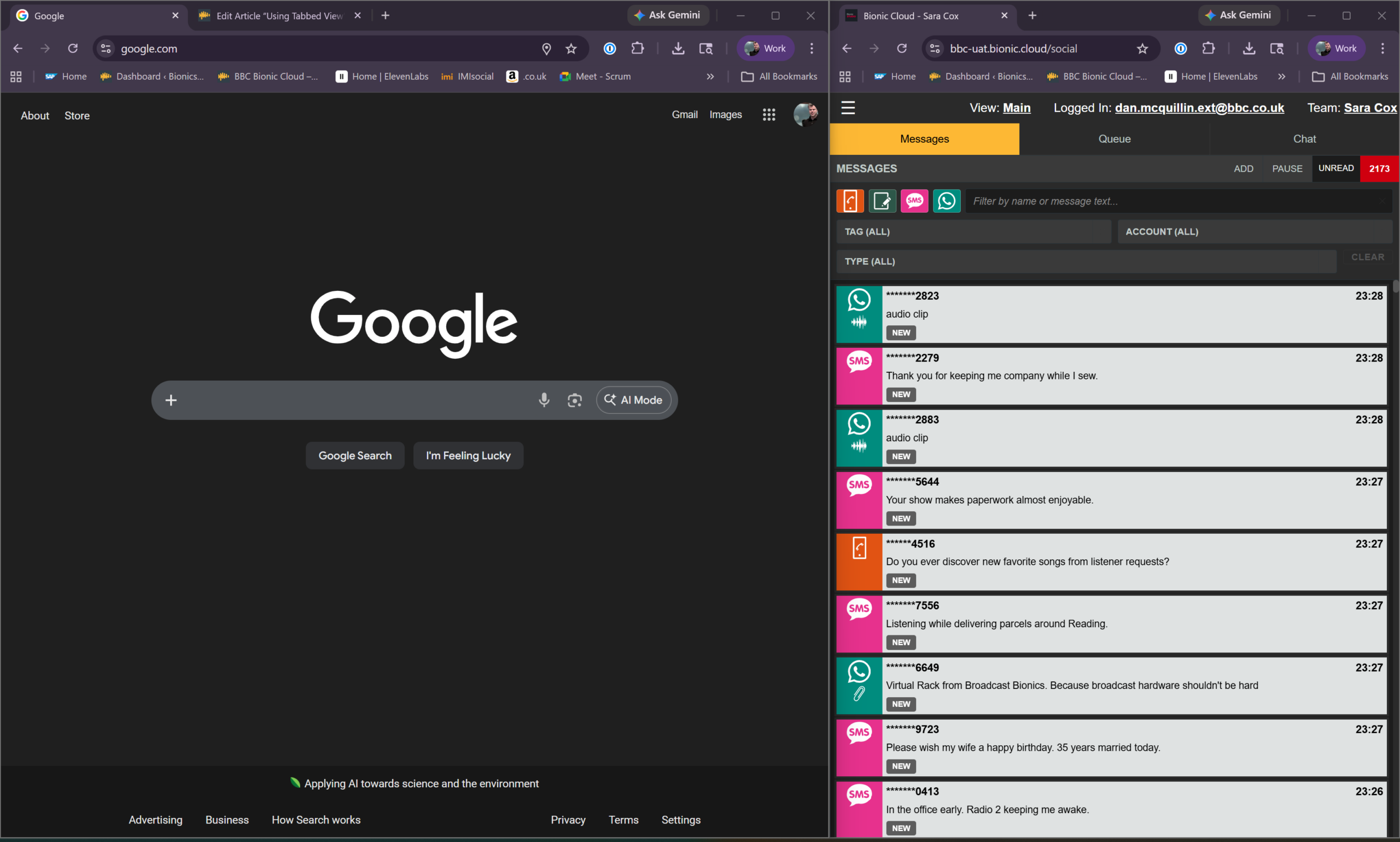 When Bionic Cloud is shown in a narrower browser window, when the browser is docked, or when you are using a mobile device, the console may switch to a tabbed view.